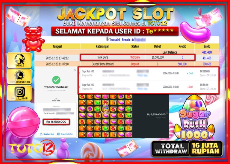 Selamat kepada Member Kami Te****** Telah Jackpot dan berhasil mendapatkan kemenangan besar pada permainan JACKPOT SLOT GAME (SUGAR RUSH 1000) Dengan Kemenangan Sebesar Rp.16.500.000 –. Setelah mengisi Fomulir Withdraw dengan Kurang waktu 1-2 Menit Dana sudah kami Trasnfer kepada Pemilik Userid dan dana sudah dapat di cairkan oleh pemenang. Bukti Pembayaran yang TOTO12 berikan merupakan Bukti…