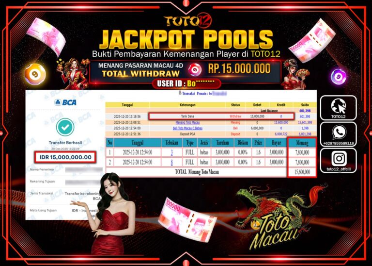 Selamat kepada Member Kami Bo****** Telah Jackpot dan berhasil mendapatkan kemenangan besar pada permainan JACKPOT POOLS PASARAN (MACAU 4D) Dengan Kemenangan Sebesar Rp.15.000.000 –. Setelah mengisi Fomulir Withdraw dengan Kurang waktu 1-2 Menit Dana sudah kami Trasnfer kepada Pemilik Userid dan dana sudah dapat di cairkan oleh pemenang. Bukti Pembayaran yang TOTO12 berikan merupakan Bukti Pembayaran…