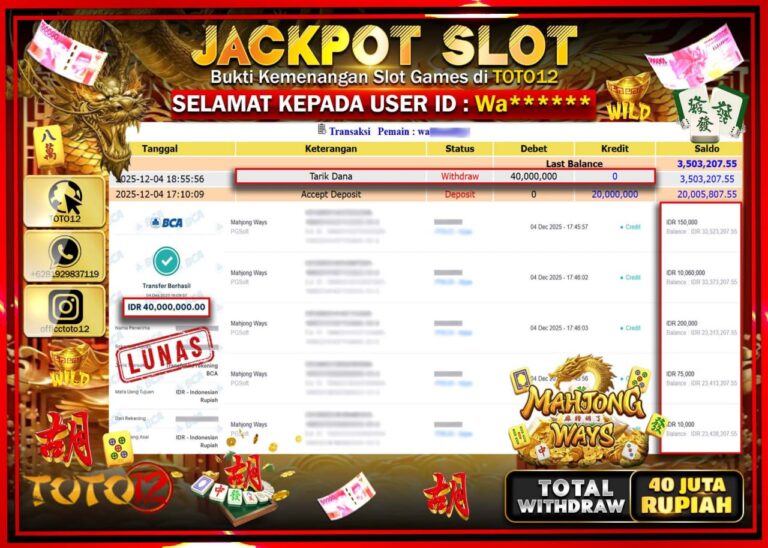Selamat kepada Member Kami Wa****** Telah Jackpot dan berhasil mendapatkan kemenangan besar pada permainan JACKPOT SLOT GAME (MAHJONG WAYS) Dengan Kemenangan Sebesar Rp.40.000.000 –. Setelah mengisi Fomulir Withdraw dengan Kurang waktu 1-2 Menit Dana sudah kami Trasnfer kepada Pemilik Userid dan dana sudah dapat di cairkan oleh pemenang. Bukti Pembayaran yang TOTO12 berikan merupakan Bukti Pembayaran…