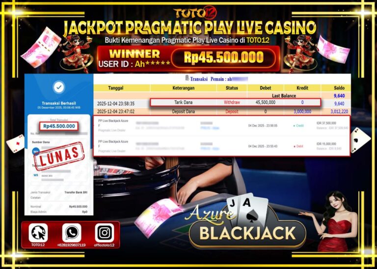 Selamat kepada Member Kami Ah****** Telah Jackpot dan berhasil mendapatkan kemenangan besar pada permainan JACKPOT PRAGMATIC PLAY LIVE CASINO (BLACKJACK AZURE) Dengan Kemenangan Sebesar Rp.45.500.000 –. Setelah mengisi Fomulir Withdraw dengan Kurang waktu 1-2 Menit Dana sudah kami Trasnfer kepada Pemilik Userid dan dana sudah dapat di cairkan oleh pemenang. Bukti Pembayaran yang TOTO12 berikan merupakan…