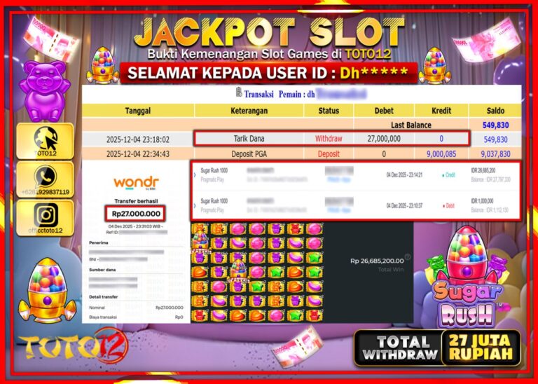 Selamat kepada Member Kami Dh****** Telah Jackpot dan berhasil mendapatkan kemenangan besar pada permainan JACKPOT SLOT GAME (SUGAR RUSH) Dengan Kemenangan Sebesar Rp.27.000.000 –. Setelah mengisi Fomulir Withdraw dengan Kurang waktu 1-2 Menit Dana sudah kami Trasnfer kepada Pemilik Userid dan dana sudah dapat di cairkan oleh pemenang. Bukti Pembayaran yang TOTO12 berikan merupakan Bukti Pembayaran…