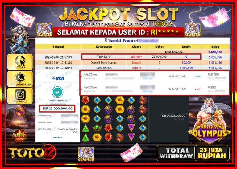 Selamat kepada Member Kami Ri****** Telah Jackpot dan berhasil mendapatkan kemenangan besar pada permainan JACKPOT SLOT GAME (GATES OF OLYMPUS) Dengan Kemenangan Sebesar Rp.23.000.000 –. Setelah mengisi Fomulir Withdraw dengan Kurang waktu 1-2 Menit Dana sudah kami Trasnfer kepada Pemilik Userid dan dana sudah dapat di cairkan oleh pemenang. Bukti Pembayaran yang TOTO12 berikan merupakan Bukti…