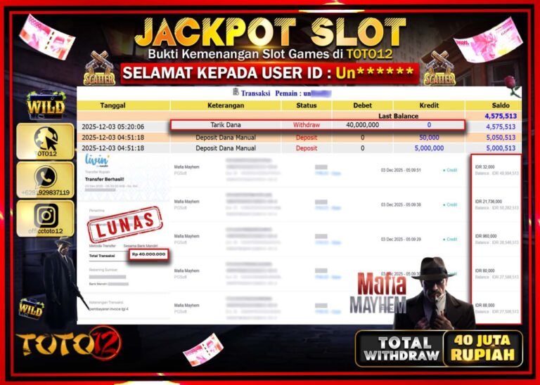Selamat kepada Member Kami Un****** Telah Jackpot dan berhasil mendapatkan kemenangan besar pada permainan JACKPOT SLOT GAME (MAFIA MAYHEM) Dengan Kemenangan Sebesar Rp.40.000.000 –. Setelah mengisi Fomulir Withdraw dengan Kurang waktu 1-2 Menit Dana sudah kami Trasnfer kepada Pemilik Userid dan dana sudah dapat di cairkan oleh pemenang. Bukti Pembayaran yang TOTO12 berikan merupakan Bukti Pembayaran…