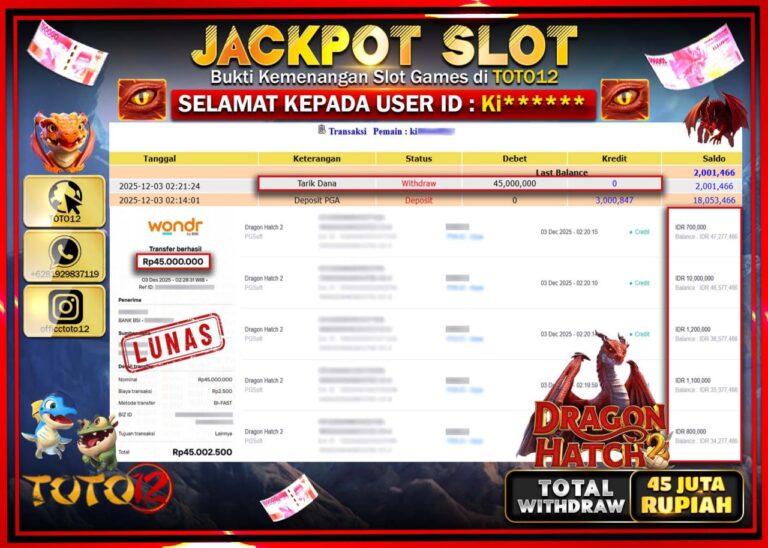 Selamat kepada Member Kami Ki****** Telah Jackpot dan berhasil mendapatkan kemenangan besar pada permainan JACKPOT SLOT GAME (DRAGON HATCH) Dengan Kemenangan Sebesar Rp.45.000.000 –. Setelah mengisi Fomulir Withdraw dengan Kurang waktu 1-2 Menit Dana sudah kami Trasnfer kepada Pemilik Userid dan dana sudah dapat di cairkan oleh pemenang. Bukti Pembayaran yang TOTO12 berikan merupakan Bukti Pembayaran…