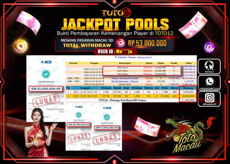 Selamat kepada Member Kami Me****** Telah Jackpot dan berhasil mendapatkan kemenangan besar pada permainan JACKPOT POOLS PASARAN (MACAU 5D) Dengan Kemenangan Sebesar Rp.53.000.000 –. Setelah mengisi Fomulir Withdraw dengan Kurang waktu 1-2 Menit Dana sudah kami Trasnfer kepada Pemilik Userid dan dana sudah dapat di cairkan oleh pemenang. Bukti Pembayaran yang TOTO12 berikan merupakan Bukti Pembayaran…