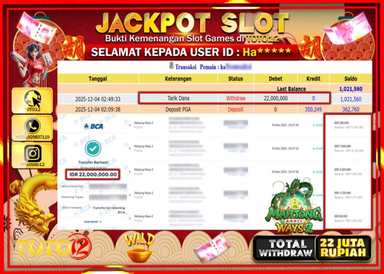 Selamat kepada Member Kami Ha****** Telah Jackpot dan berhasil mendapatkan kemenangan besar pada permainan JACKPOT SLOT GAME (MAHJONG WAYS 2) Dengan Kemenangan Sebesar Rp.22.000.000 –. Setelah mengisi Fomulir Withdraw dengan Kurang waktu 1-2 Menit Dana sudah kami Trasnfer kepada Pemilik Userid dan dana sudah dapat di cairkan oleh pemenang. Bukti Pembayaran yang TOTO12 berikan merupakan Bukti…