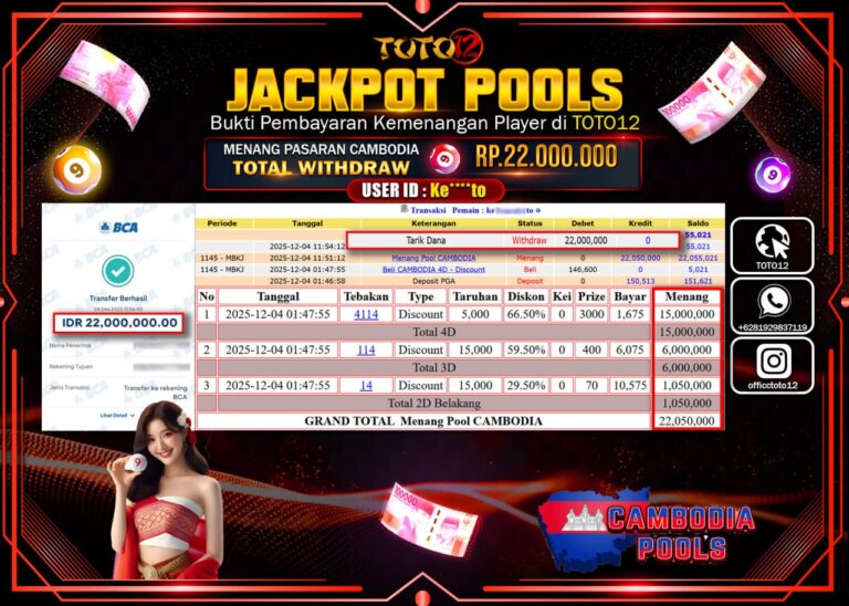 Selamat kepada Member Kami Ke****** Telah Jackpot dan berhasil mendapatkan kemenangan besar pada permainan JACKPOT POOLS PASARAN (CAMBODIA) Dengan Kemenangan Sebesar Rp.22.000.000 –. Setelah mengisi Fomulir Withdraw dengan Kurang waktu 1-2 Menit Dana sudah kami Trasnfer kepada Pemilik Userid dan dana sudah dapat di cairkan oleh pemenang. Bukti Pembayaran yang TOTO12 berikan merupakan Bukti Pembayaran yang SAH…