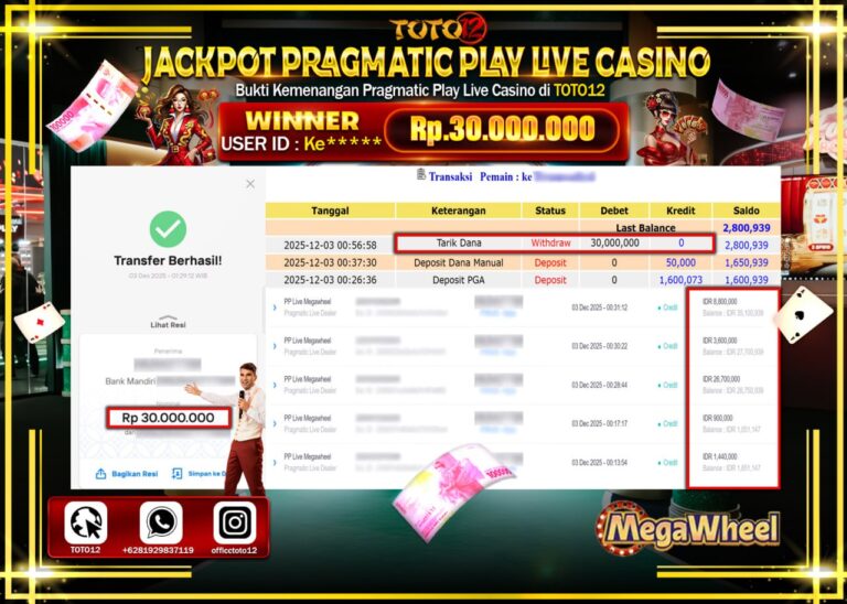 Selamat kepada Member Kami Ke****** Telah Jackpot dan berhasil mendapatkan kemenangan besar pada permainan JACKPOT PRAGMATIC PLAY LIVE CASINO (MEGA WHEEL) Dengan Kemenangan Sebesar Rp.30.000.000 –. Setelah mengisi Fomulir Withdraw dengan Kurang waktu 1-2 Menit Dana sudah kami Trasnfer kepada Pemilik Userid dan dana sudah dapat di cairkan oleh pemenang. Bukti Pembayaran yang TOTO12 berikan merupakan…