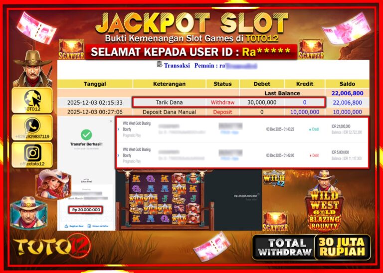 Selamat kepada Member Kami Ra****** Telah Jackpot dan berhasil mendapatkan kemenangan besar pada permainan JACKPOT SLOT GAME (WILD BEST GOLD BLAZING BOUNTY) Dengan Kemenangan Sebesar Rp.30.000.000 –. Setelah mengisi Fomulir Withdraw dengan Kurang waktu 1-2 Menit Dana sudah kami Trasnfer kepada Pemilik Userid dan dana sudah dapat di cairkan oleh pemenang. Bukti Pembayaran yang TOTO12 berikan…