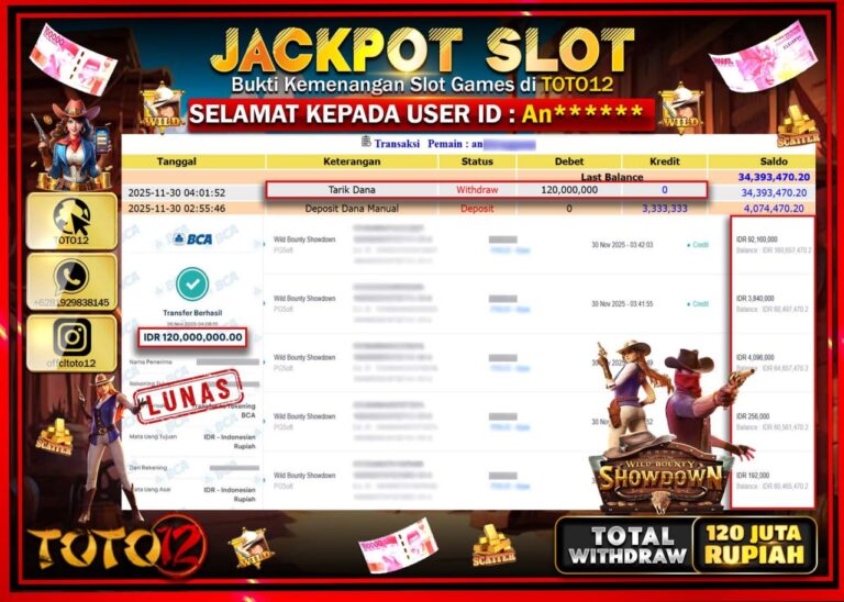 Selamat kepada Member Kami An****** Telah Jackpot dan berhasil mendapatkan kemenangan besar pada permainan JACKPOT SLOT GAME (WILD BOUNTY SHOWDOWN) Dengan Kemenangan Sebesar Rp.120.000.000 –. Setelah mengisi Fomulir Withdraw dengan Kurang waktu 1-2 Menit Dana sudah kami Trasnfer kepada Pemilik Userid dan dana sudah dapat di cairkan oleh pemenang. Bukti Pembayaran yang TOTO12 berikan merupakan Bukti…