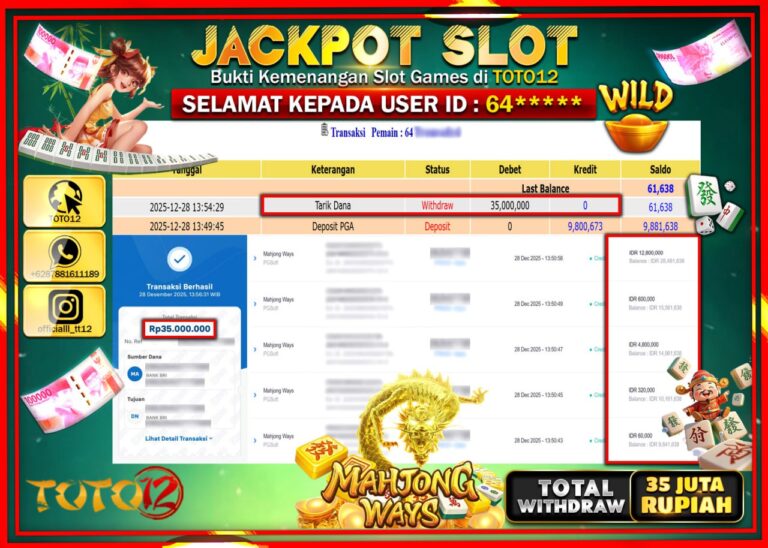 Selamat kepada Member Kami 64****** Telah Jackpot dan berhasil mendapatkan kemenangan besar pada permainan JACKPOT SLOT GAME (MAHJONG WAYS) Dengan Kemenangan Sebesar Rp.35.000.000 –. Setelah mengisi Fomulir Withdraw dengan Kurang waktu 1-2 Menit Dana sudah kami Trasnfer kepada Pemilik Userid dan dana sudah dapat di cairkan oleh pemenang. Bukti Pembayaran yang TOTO12 berikan merupakan Bukti Pembayaran…