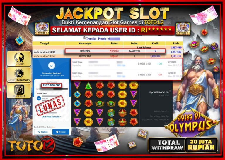 Selamat kepada Member Kami Ri****** Telah Jackpot dan berhasil mendapatkan kemenangan besar pada permainan JACKPOT SLOT GAME (GATES OF OLYMPUS) Dengan Kemenangan Sebesar Rp.20.000.000 –. Setelah mengisi Fomulir Withdraw dengan Kurang waktu 1-2 Menit Dana sudah kami Trasnfer kepada Pemilik Userid dan dana sudah dapat di cairkan oleh pemenang. Bukti Pembayaran yang TOTO12 berikan merupakan Bukti…