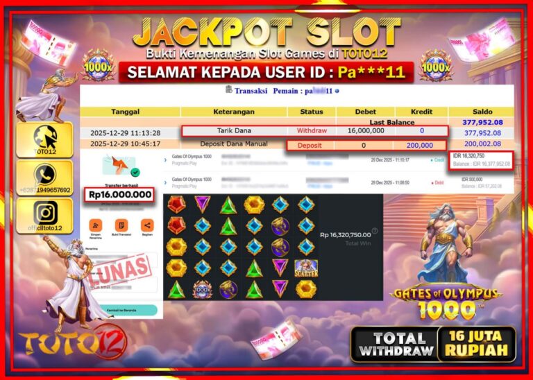Selamat kepada Member Kami Pa****** Telah Jackpot dan berhasil mendapatkan kemenangan besar pada permainan JACKPOT SLOT GAME (GATES OF OLYMPUS 1000) Dengan Kemenangan Sebesar Rp.16.000.000 –. Setelah mengisi Fomulir Withdraw dengan Kurang waktu 1-2 Menit Dana sudah kami Trasnfer kepada Pemilik Userid dan dana sudah dapat di cairkan oleh pemenang. Bukti Pembayaran yang TOTO12 berikan merupakan…