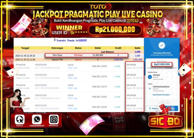Selamat kepada Member Kami Br****** Telah Jackpot dan berhasil mendapatkan kemenangan besar pada permainan JACKPOT PRAGMATIC PLAY LIVE CASINO (SIC BO) Dengan Kemenangan Sebesar Rp.21.000.000 –. Setelah mengisi Fomulir Withdraw dengan Kurang waktu 1-2 Menit Dana sudah kami Trasnfer kepada Pemilik Userid dan dana sudah dapat di cairkan oleh pemenang. Bukti Pembayaran yang TOTO12 berikan merupakan…