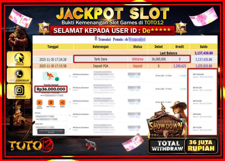 Selamat kepada Member Kami De****** Telah Jackpot dan berhasil mendapatkan kemenangan besar pada permainan JACKPOT SLOT GAME (WILD BOUNTY SHOWDOWN) Dengan Kemenangan Sebesar Rp.36.000.000 –. Setelah mengisi Fomulir Withdraw dengan Kurang waktu 1-2 Menit Dana sudah kami Trasnfer kepada Pemilik Userid dan dana sudah dapat di cairkan oleh pemenang. Bukti Pembayaran yang TOTO12 berikan merupakan Bukti…