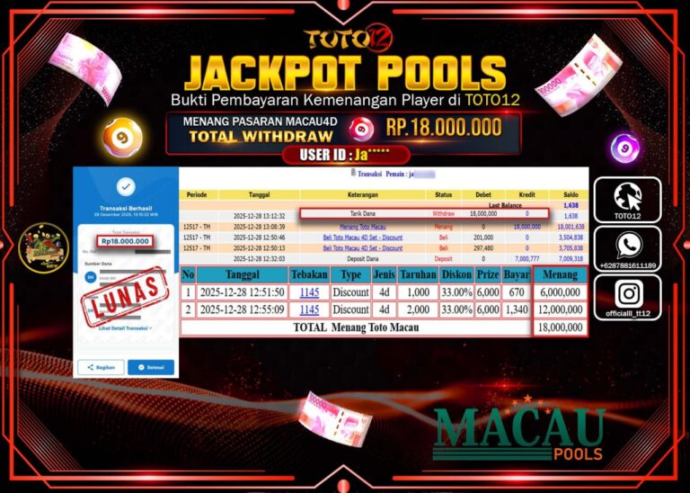 Selamat kepada Member Kami Ja****** Telah Jackpot dan berhasil mendapatkan kemenangan besar pada permainan JACKPOT POOLS PASARAN (MACAU 4D) Dengan Kemenangan Sebesar Rp.18.000.000 –. Setelah mengisi Fomulir Withdraw dengan Kurang waktu 1-2 Menit Dana sudah kami Trasnfer kepada Pemilik Userid dan dana sudah dapat di cairkan oleh pemenang. Bukti Pembayaran yang TOTO12 berikan merupakan Bukti Pembayaran…