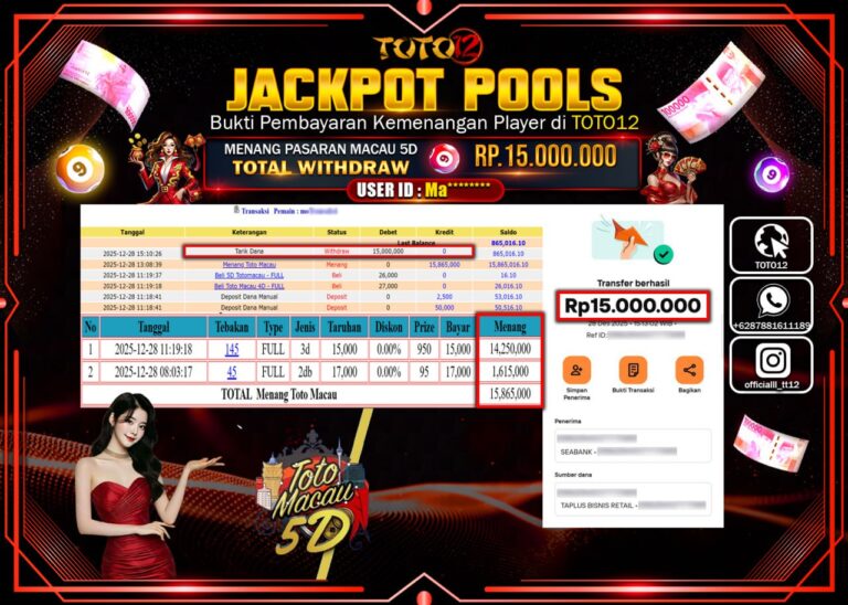 Selamat kepada Member Kami Ma****** Telah Jackpot dan berhasil mendapatkan kemenangan besar pada permainan JACKPOT POOLS PASARAN (MACAU 5D) Dengan Kemenangan Sebesar Rp.15.000.000 –. Setelah mengisi Fomulir Withdraw dengan Kurang waktu 1-2 Menit Dana sudah kami Trasnfer kepada Pemilik Userid dan dana sudah dapat di cairkan oleh pemenang. Bukti Pembayaran yang TOTO12 berikan merupakan Bukti Pembayaran…
