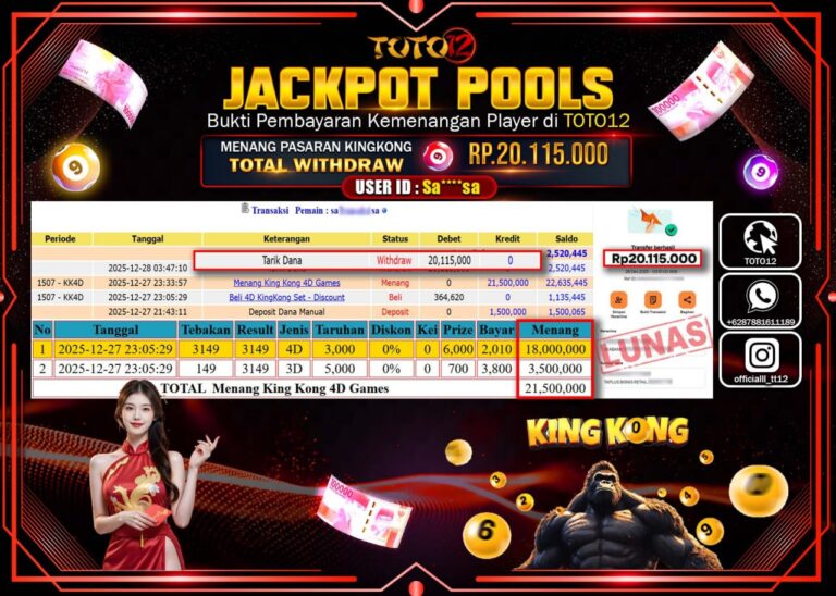 Selamat kepada Member Kami Sa****** Telah Jackpot dan berhasil mendapatkan kemenangan besar pada permainan JACKPOT POOLS PASARAN (KING KONG 4D) Dengan Kemenangan Sebesar Rp.20.115.000 –. Setelah mengisi Fomulir Withdraw dengan Kurang waktu 1-2 Menit Dana sudah kami Trasnfer kepada Pemilik Userid dan dana sudah dapat di cairkan oleh pemenang. Bukti Pembayaran yang TOTO12 berikan merupakan Bukti…