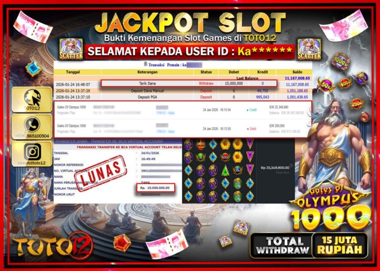 Selamat kepada Member Kami Ka****** Telah Jackpot dan berhasil mendapatkan kemenangan besar pada permainan JACKPOT SLOT GAME (GATES OF OLYMPUS 1000) Dengan Kemenangan Sebesar Rp.15.000.000 –. Setelah mengisi Fomulir Withdraw dengan Kurang waktu 1-2 Menit Dana sudah kami Trasnfer kepada Pemilik Userid dan dana sudah dapat di cairkan oleh pemenang. Bukti Pembayaran yang TOTO12 berikan merupakan…