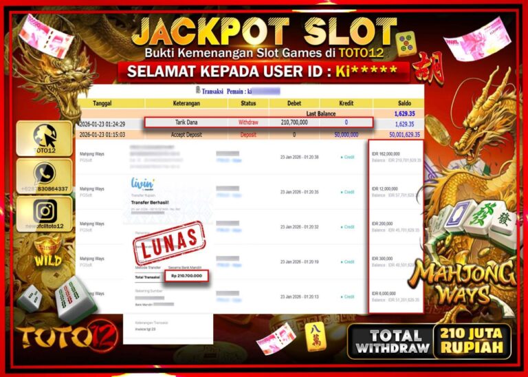 Selamat kepada Member Kami Ki****** Telah Jackpot dan berhasil mendapatkan kemenangan besar pada permainan JACKPOT SLOT GAME (MAHJONG WAYS) Dengan Kemenangan Sebesar Rp.210.700.000 –. Setelah mengisi Fomulir Withdraw dengan Kurang waktu 1-2 Menit Dana sudah kami Trasnfer kepada Pemilik Userid dan dana sudah dapat di cairkan oleh pemenang. Bukti Pembayaran yang TOTO12 berikan merupakan Bukti Pembayaran…
