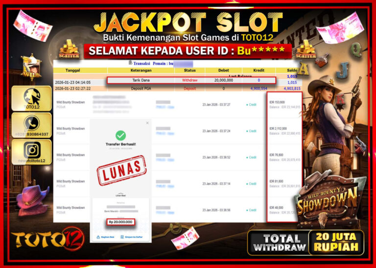 Selamat kepada Member Kami Bu****** Telah Jackpot dan berhasil mendapatkan kemenangan besar pada permainan JACKPOT SLOT GAME (WILD BOUNTY SHOWDOWN) Dengan Kemenangan Sebesar Rp.20.000.000 –. Setelah mengisi Fomulir Withdraw dengan Kurang waktu 1-2 Menit Dana sudah kami Trasnfer kepada Pemilik Userid dan dana sudah dapat di cairkan oleh pemenang. Bukti Pembayaran yang TOTO12 berikan merupakan Bukti…