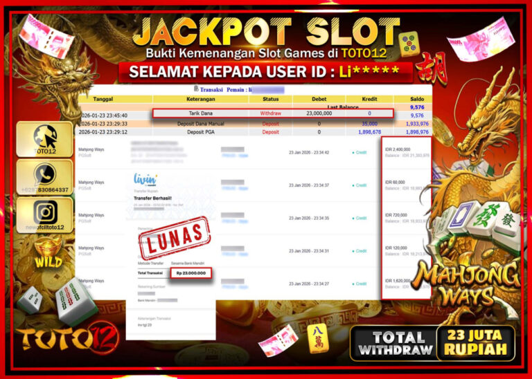 Selamat kepada Member Kami Li****** Telah Jackpot dan berhasil mendapatkan kemenangan besar pada permainan JACKPOT SLOT GAME (MAHJONG WAYS) Dengan Kemenangan Sebesar Rp.23.000.000 –. Setelah mengisi Fomulir Withdraw dengan Kurang waktu 1-2 Menit Dana sudah kami Trasnfer kepada Pemilik Userid dan dana sudah dapat di cairkan oleh pemenang. Bukti Pembayaran yang TOTO12 berikan merupakan Bukti Pembayaran…