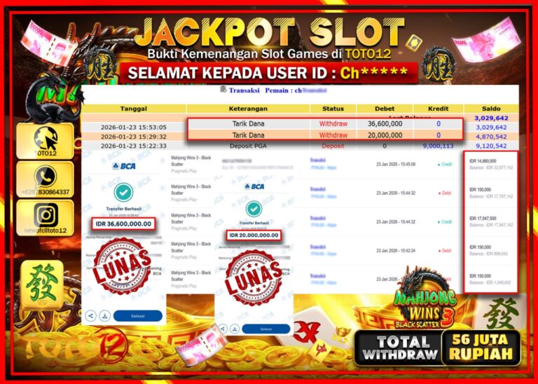 Selamat kepada Member Kami Ch****** Telah Jackpot dan berhasil mendapatkan kemenangan besar pada permainan JACKPOT SLOT GAME (MAHJONG WINS 3 BLACK SCATTER) Dengan Kemenangan Sebesar Rp.56.600.000 –. Setelah mengisi Fomulir Withdraw dengan Kurang waktu 1-2 Menit Dana sudah kami Trasnfer kepada Pemilik Userid dan dana sudah dapat di cairkan oleh pemenang. Bukti Pembayaran yang TOTO12 berikan…