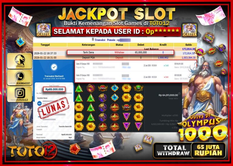 Selamat kepada Member Kami Op****** Telah Jackpot dan berhasil mendapatkan kemenangan besar pada permainan JACKPOT SLOT GAME (GATES OF OLYMPUS 1000) Dengan Kemenangan Sebesar Rp.65.000.000 –. Setelah mengisi Fomulir Withdraw dengan Kurang waktu 1-2 Menit Dana sudah kami Trasnfer kepada Pemilik Userid dan dana sudah dapat di cairkan oleh pemenang. Bukti Pembayaran yang TOTO12 berikan merupakan…