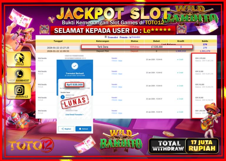 Selamat kepada Member Kami Le****** Telah Jackpot dan berhasil mendapatkan kemenangan besar pada permainan JACKPOT SLOT GAME (WILD BANDITO) Dengan Kemenangan Sebesar Rp.17.535.000 –. Setelah mengisi Fomulir Withdraw dengan Kurang waktu 1-2 Menit Dana sudah kami Trasnfer kepada Pemilik Userid dan dana sudah dapat di cairkan oleh pemenang. Bukti Pembayaran yang TOTO12 berikan merupakan Bukti Pembayaran…