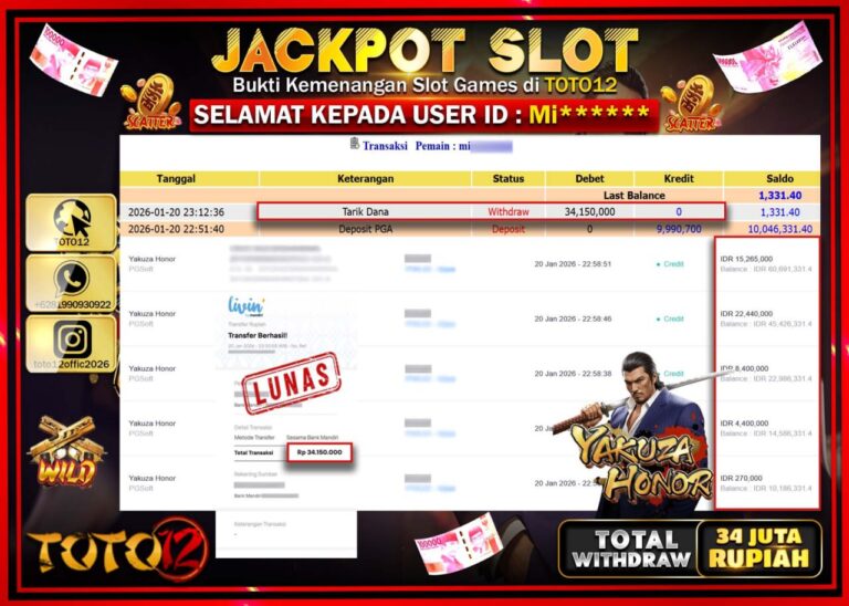 Selamat kepada Member Kami Mi****** Telah Jackpot dan berhasil mendapatkan kemenangan besar pada permainan JACKPOT SLOT GAME (YAKUZA HONOR) Dengan Kemenangan Sebesar Rp.34.150.000 –. Setelah mengisi Fomulir Withdraw dengan Kurang waktu 1-2 Menit Dana sudah kami Trasnfer kepada Pemilik Userid dan dana sudah dapat di cairkan oleh pemenang. Bukti Pembayaran yang TOTO12 berikan merupakan Bukti Pembayaran…