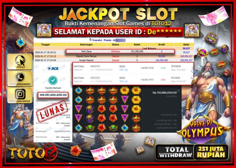 Selamat kepada Member Kami De****** Telah Jackpot dan berhasil mendapatkan kemenangan besar pada permainan JACKPOT SLOT GAME (GATES OF OLYMPUS) Dengan Kemenangan Sebesar Rp.251.000.000 –. Setelah mengisi Fomulir Withdraw dengan Kurang waktu 1-2 Menit Dana sudah kami Trasnfer kepada Pemilik Userid dan dana sudah dapat di cairkan oleh pemenang. Bukti Pembayaran yang TOTO12 berikan merupakan Bukti…