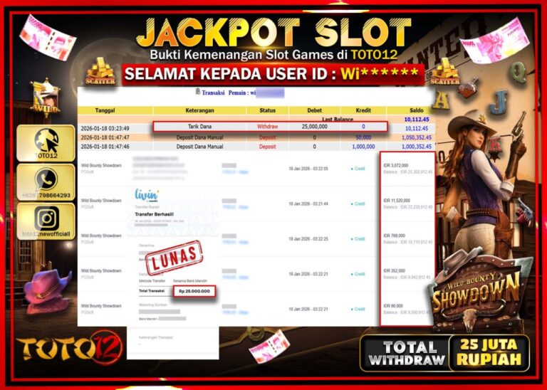 Selamat kepada Member Kami Wi****** Telah Jackpot dan berhasil mendapatkan kemenangan besar pada permainan JACKPOT SLOT GAME (WILD BOUNTY SHOWDOWN) Dengan Kemenangan Sebesar Rp.25.000.000 –. Setelah mengisi Fomulir Withdraw dengan Kurang waktu 1-2 Menit Dana sudah kami Trasnfer kepada Pemilik Userid dan dana sudah dapat di cairkan oleh pemenang. Bukti Pembayaran yang TOTO12 berikan merupakan Bukti…