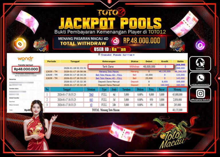 Selamat kepada Member Kami Ka****** Telah Jackpot dan berhasil mendapatkan kemenangan besar pada permainan JACKPOT POOLS PASARAN (MACAU 4D) Dengan Kemenangan Sebesar Rp.48.000.000 –. Setelah mengisi Fomulir Withdraw dengan Kurang waktu 1-2 Menit Dana sudah kami Trasnfer kepada Pemilik Userid dan dana sudah dapat di cairkan oleh pemenang. Bukti Pembayaran yang TOTO12 berikan merupakan Bukti Pembayaran…