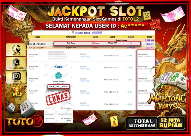 Selamat kepada Member Kami Ae****** Telah Jackpot dan berhasil mendapatkan kemenangan besar pada permainan JACKPOT SLOT GAME (MAHJONG WAYS) Dengan Kemenangan Sebesar Rp.52.000.000 –. Setelah mengisi Fomulir Withdraw dengan Kurang waktu 1-2 Menit Dana sudah kami Trasnfer kepada Pemilik Userid dan dana sudah dapat di cairkan oleh pemenang. Bukti Pembayaran yang TOTO12 berikan merupakan Bukti Pembayaran…