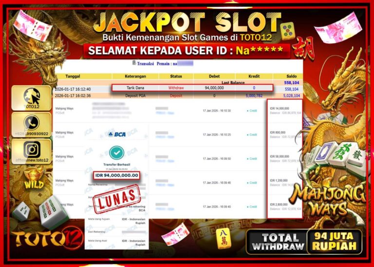 Selamat kepada Member Kami Na****** Telah Jackpot dan berhasil mendapatkan kemenangan besar pada permainan JACKPOT SLOT GAME (MAHJONG WAYS) Dengan Kemenangan Sebesar Rp.94.000.000 –. Setelah mengisi Fomulir Withdraw dengan Kurang waktu 1-2 Menit Dana sudah kami Trasnfer kepada Pemilik Userid dan dana sudah dapat di cairkan oleh pemenang. Bukti Pembayaran yang TOTO12 berikan merupakan Bukti Pembayaran…