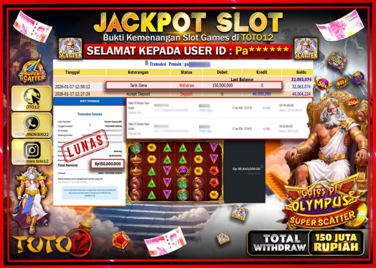 Selamat kepada Member Kami Pa****** Telah Jackpot dan berhasil mendapatkan kemenangan besar pada permainan JACKPOT SLOT GAME (GATES OF OLYMPUS SUPER SCATTER) Dengan Kemenangan Sebesar Rp.150.000.000 –. Setelah mengisi Fomulir Withdraw dengan Kurang waktu 1-2 Menit Dana sudah kami Trasnfer kepada Pemilik Userid dan dana sudah dapat di cairkan oleh pemenang. Bukti Pembayaran yang TOTO12 berikan…