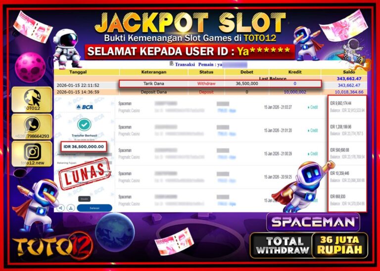 Selamat kepada Member Kami Ya****** Telah Jackpot dan berhasil mendapatkan kemenangan besar pada permainan JACKPOT SLOT GAME (SPACEMAN) Dengan Kemenangan Sebesar Rp.36.500.000 –. Setelah mengisi Fomulir Withdraw dengan Kurang waktu 1-2 Menit Dana sudah kami Trasnfer kepada Pemilik Userid dan dana sudah dapat di cairkan oleh pemenang. Bukti Pembayaran yang TOTO12 berikan merupakan Bukti Pembayaran yang SAH…