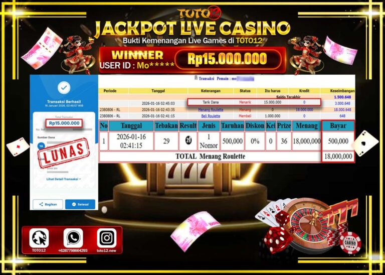 Selamat kepada Member Kami Mo****** Telah Jackpot dan berhasil mendapatkan kemenangan besar pada permainan JACKPOT LIVE CASINO (ROULETTE) Dengan Kemenangan Sebesar Rp.15.000.000 –. Setelah mengisi Fomulir Withdraw dengan Kurang waktu 1-2 Menit Dana sudah kami Trasnfer kepada Pemilik Userid dan dana sudah dapat di cairkan oleh pemenang. Bukti Pembayaran yang TOTO12 berikan merupakan Bukti Pembayaran yang SAH…