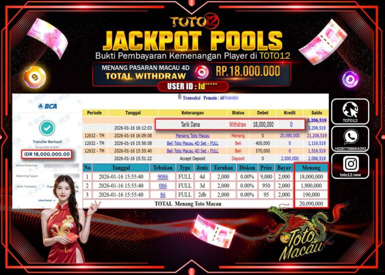 Selamat kepada Member Kami Id****** Telah Jackpot dan berhasil mendapatkan kemenangan besar pada permainan JACKPOT POOLS PASARAN (MACAU 4D) Dengan Kemenangan Sebesar Rp.18.000.000 –. Setelah mengisi Fomulir Withdraw dengan Kurang waktu 1-2 Menit Dana sudah kami Trasnfer kepada Pemilik Userid dan dana sudah dapat di cairkan oleh pemenang. Bukti Pembayaran yang TOTO12 berikan merupakan Bukti Pembayaran…