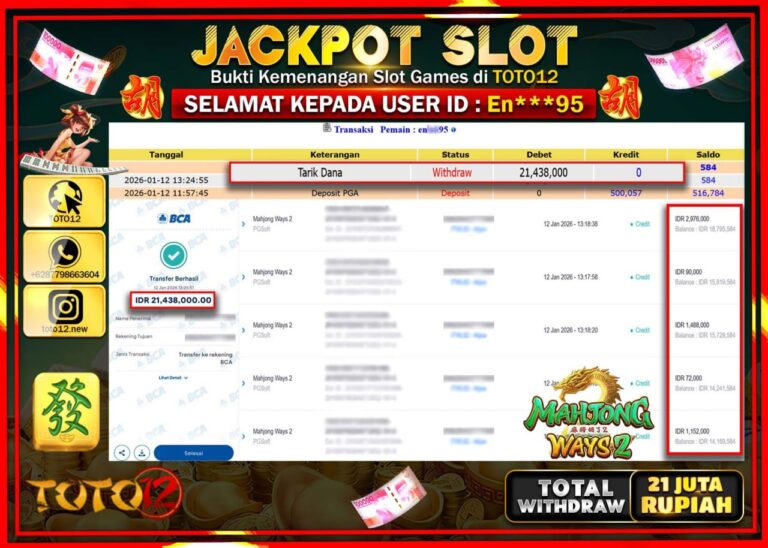 Selamat kepada Member Kami En****** Telah Jackpot dan berhasil mendapatkan kemenangan besar pada permainan JACKPOT SLOT GAME (MAHJONG WAYS 2) Dengan Kemenangan Sebesar Rp.21.438.000 –. Setelah mengisi Fomulir Withdraw dengan Kurang waktu 1-2 Menit Dana sudah kami Trasnfer kepada Pemilik Userid dan dana sudah dapat di cairkan oleh pemenang. Bukti Pembayaran yang TOTO12 berikan merupakan Bukti…