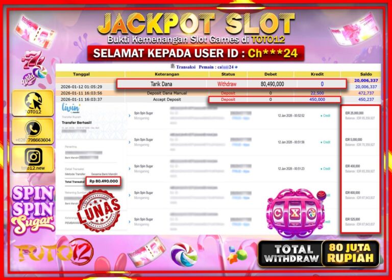 Selamat kepada Member Kami Ch****** Telah Jackpot dan berhasil mendapatkan kemenangan besar pada permainan JACKPOT SLOT GAME (SPIN SPIN SUGAR) Dengan Kemenangan Sebesar Rp.80.490.000 –. Setelah mengisi Fomulir Withdraw dengan Kurang waktu 1-2 Menit Dana sudah kami Trasnfer kepada Pemilik Userid dan dana sudah dapat di cairkan oleh pemenang. Bukti Pembayaran yang TOTO12 berikan merupakan Bukti…