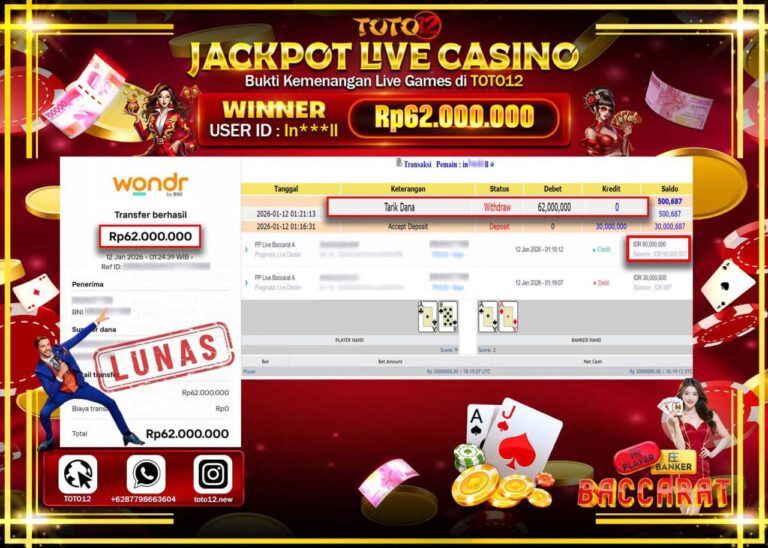 Selamat kepada Member Kami In****** Telah Jackpot dan berhasil mendapatkan kemenangan besar pada permainan JACKPOT LIVE CASINO (LIVE BACCARAT) Dengan Kemenangan Sebesar Rp.62.000.000 –. Setelah mengisi Fomulir Withdraw dengan Kurang waktu 1-2 Menit Dana sudah kami Trasnfer kepada Pemilik Userid dan dana sudah dapat di cairkan oleh pemenang. Bukti Pembayaran yang TOTO12 berikan merupakan Bukti Pembayaran…