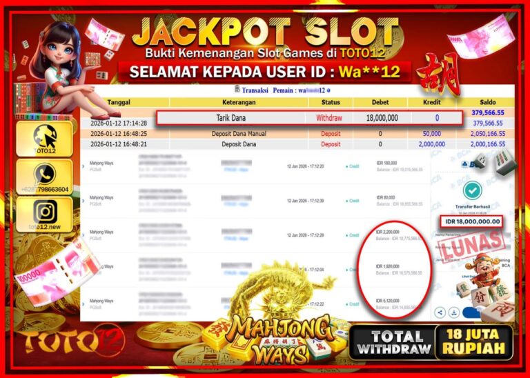 Selamat kepada Member Kami Wa****** Telah Jackpot dan berhasil mendapatkan kemenangan besar pada permainan JACKPOT SLOT GAME (MAHJONG WAYS) Dengan Kemenangan Sebesar Rp.18.000.000 –. Setelah mengisi Fomulir Withdraw dengan Kurang waktu 1-2 Menit Dana sudah kami Trasnfer kepada Pemilik Userid dan dana sudah dapat di cairkan oleh pemenang. Bukti Pembayaran yang TOTO12 berikan merupakan Bukti Pembayaran…