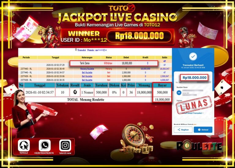Selamat kepada Member Kami Mo****** Telah Jackpot dan berhasil mendapatkan kemenangan besar pada permainan JACKPOT LIVE CASINO (ROULETTE) Dengan Kemenangan Sebesar Rp.18.000.000 –. Setelah mengisi Fomulir Withdraw dengan Kurang waktu 1-2 Menit Dana sudah kami Trasnfer kepada Pemilik Userid dan dana sudah dapat di cairkan oleh pemenang. Bukti Pembayaran yang TOTO12 berikan merupakan Bukti Pembayaran yang SAH…