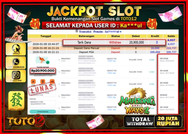 Selamat kepada Member Kami Ka****uL Telah Jackpot dan berhasil mendapatkan kemenangan besar pada permainan JACKPOT SLOT GAME (MAHJONG WAYS 2) Dengan Kemenangan Sebesar Rp.20.000.000 –. Setelah mengisi Fomulir Withdraw dengan Kurang waktu 1-2 Menit Dana sudah kami Trasnfer kepada Pemilik Userid dan dana sudah dapat di cairkan oleh pemenang. Bukti Pembayaran yang TOTO12 berikan merupakan Bukti…
