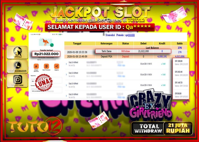 Selamat kepada Member Kami Qa****** Telah Jackpot dan berhasil mendapatkan kemenangan besar pada permainan JACKPOT SLOT GAME (CRAZY EX GIRLFRIEND) Dengan Kemenangan Sebesar Rp.21.000.000 –. Setelah mengisi Fomulir Withdraw dengan Kurang waktu 1-2 Menit Dana sudah kami Trasnfer kepada Pemilik Userid dan dana sudah dapat di cairkan oleh pemenang. Bukti Pembayaran yang TOTO12 berikan merupakan Bukti…