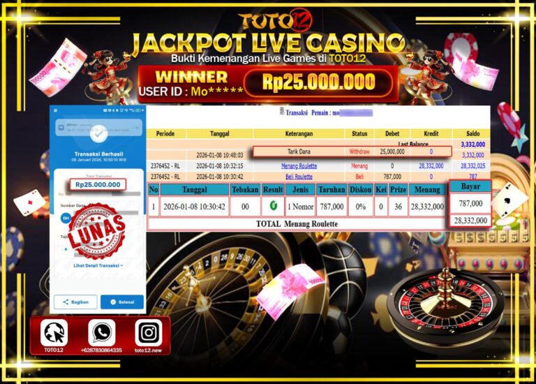 Selamat kepada Member Kami Mo****** Telah Jackpot dan berhasil mendapatkan kemenangan besar pada permainan JACKPOT LIVE GAMES CASINO (ROULETTE) Dengan Kemenangan Sebesar Rp.25.000.000 –. Setelah mengisi Fomulir Withdraw dengan Kurang waktu 1-2 Menit Dana sudah kami Trasnfer kepada Pemilik Userid dan dana sudah dapat di cairkan oleh pemenang. Bukti Pembayaran yang TOTO12 berikan merupakan Bukti Pembayaran…