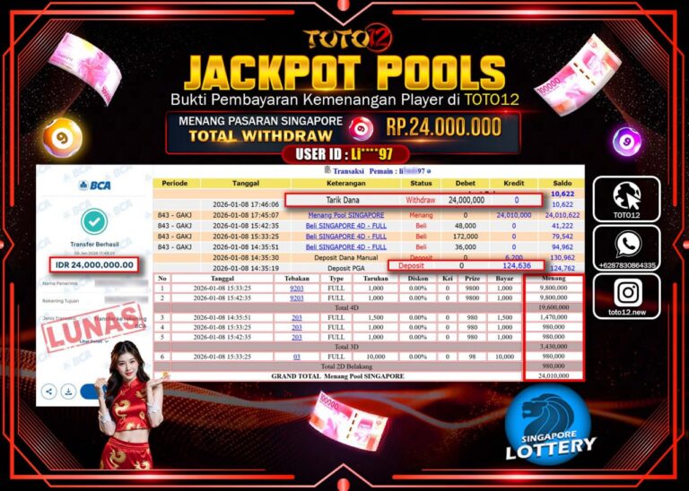 Selamat kepada Member Kami iL****97 Telah Jackpot dan berhasil mendapatkan kemenangan besar pada permainan JACKPOT POOLS PASARAN (MACAU4D) Dengan Kemenangan Sebesar Rp.24.000.000 –. Setelah mengisi Fomulir Withdraw dengan Kurang waktu 1-2 Menit Dana sudah kami Trasnfer kepada Pemilik Userid dan dana sudah dapat di cairkan oleh pemenang. Bukti Pembayaran yang TOTO12 berikan merupakan Bukti Pembayaran yang SAH…