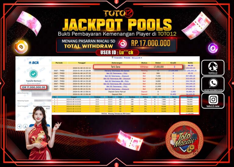 Selamat kepada Member Kami Lu****cK Telah Jackpot dan berhasil mendapatkan kemenangan besar pada permainan JACKPOT POOLS PASARAN (MACAU5D) Dengan Kemenangan Sebesar Rp.17.000.000 –. Setelah mengisi Fomulir Withdraw dengan Kurang waktu 1-2 Menit Dana sudah kami Trasnfer kepada Pemilik Userid dan dana sudah dapat di cairkan oleh pemenang. Bukti Pembayaran yang TOTO12 berikan merupakan Bukti Pembayaran yang SAH…