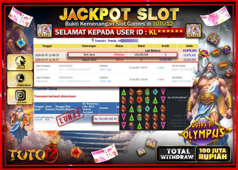 Selamat kepada Member Kami Kl****** Telah Jackpot dan berhasil mendapatkan kemenangan besar pada permainan JACKPOT SLOT GAME (GATES OF OLYMPUS) Dengan Kemenangan Sebesar Rp.100.000.000 –. Setelah mengisi Fomulir Withdraw dengan Kurang waktu 1-2 Menit Dana sudah kami Trasnfer kepada Pemilik Userid dan dana sudah dapat di cairkan oleh pemenang. Bukti Pembayaran yang TOTO12 berikan merupakan Bukti…